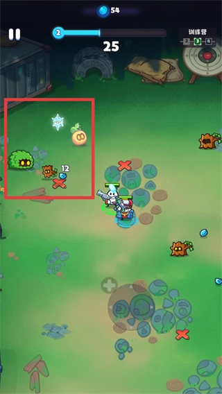 在战斗场景里,攻击红框内的敌人,拾取橙色道具,还要避开红色×障碍来推进关卡。