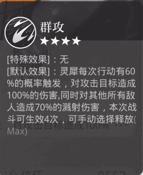 群攻:群体伤害,单次造成伤害,有概率触发,每局游戏最多触发4次。