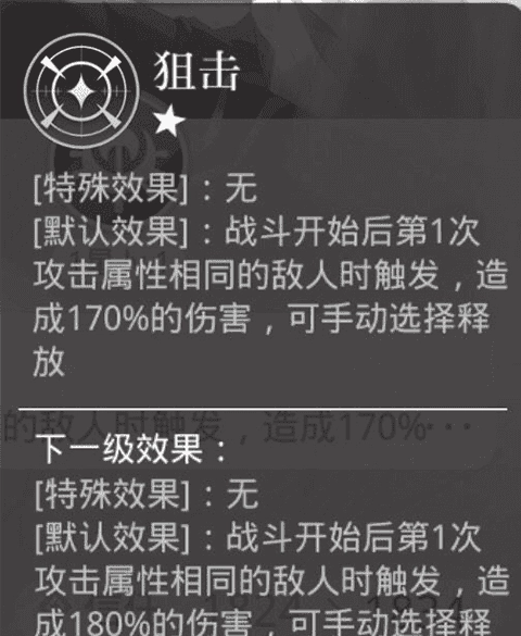 狙击:当遭遇相同属性时触发效果,对目标造成单次百分比伤害,该效果在触发次数上没有限制。