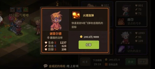 带有名字的精英角色无法获取,毕竟需要氪金。所以这时得继续在营地招募橙色级别的角色。阵型有两种选择:一是2个弓箭手搭配1个战士,二是2个法师搭配1个弓箭手。这个阶段需要阵容具备更强的输出能力,因此对进攻效率要求很高。而角色技能要兼顾范围伤害特性和群体治疗效果。