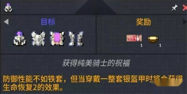 前期建议带上你的石镐,去附近的浅层矿洞寻找银矿。银矿石不算特别稀有,从地表一直到深板岩区域都能找到它的踪迹。总之尽量多收集一些,然后用这些银矿石制作银甲。穿上银甲后,你就能获得永久的生命恢复效果(等级2),这样除了通过食物回血外,就又多了一种额外的回血方式。