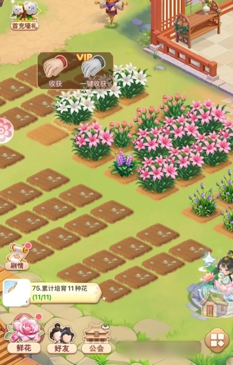 当花卉成熟后,使用手掌图标进行收获操作。
