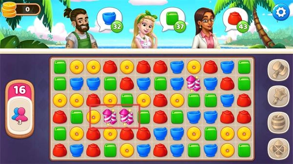 进入消除关卡后,需要收集的目标是【杯子-32】【盒子-37】【红球-43】,当前还剩【16】步,通过消除对应元素来达成目标。