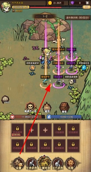 战斗胜利后会掉落道具和装备,点击一键拾取即可获取这些物品,收集到的物品能够用来强化角色。