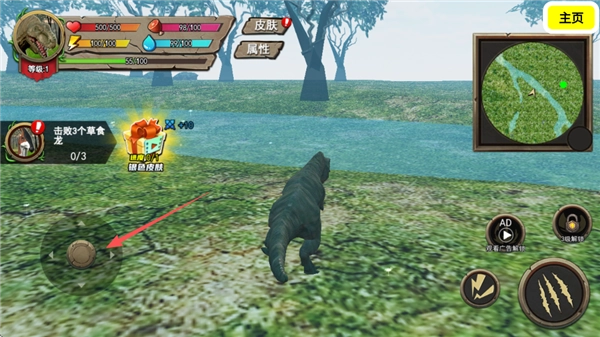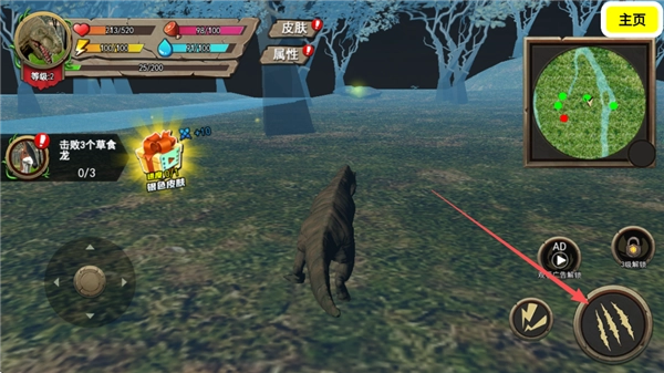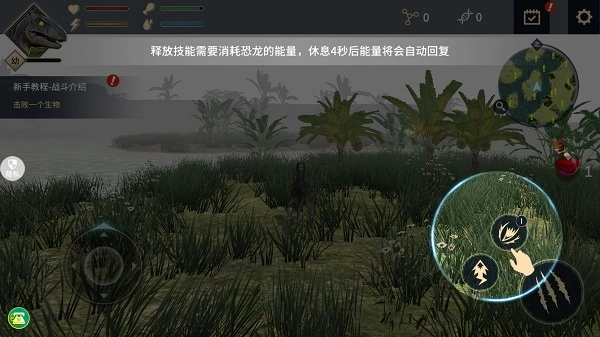 创建好游戏存档并进入游戏后,先开启新手教学模式。此时,左侧的虚拟摇杆可用于操控恐龙移动,右侧下方设有攻击按钮,而攻击按钮的左上方则是技能按钮。需要注意的是,释放技能会消耗恐龙的能量,不过让恐龙尝试休息后,能量便会自动恢复。