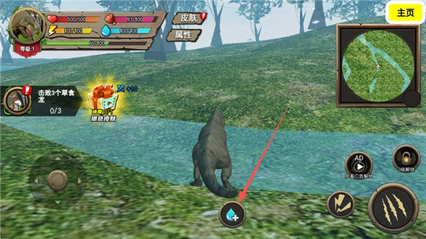 走到河边时,点击“饮水”按钮会让恐龙饮水