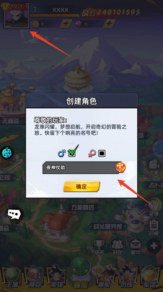 2、选定性别后,左上角的头像会随之改变,若选择男性,对应的头像则是小悟空。