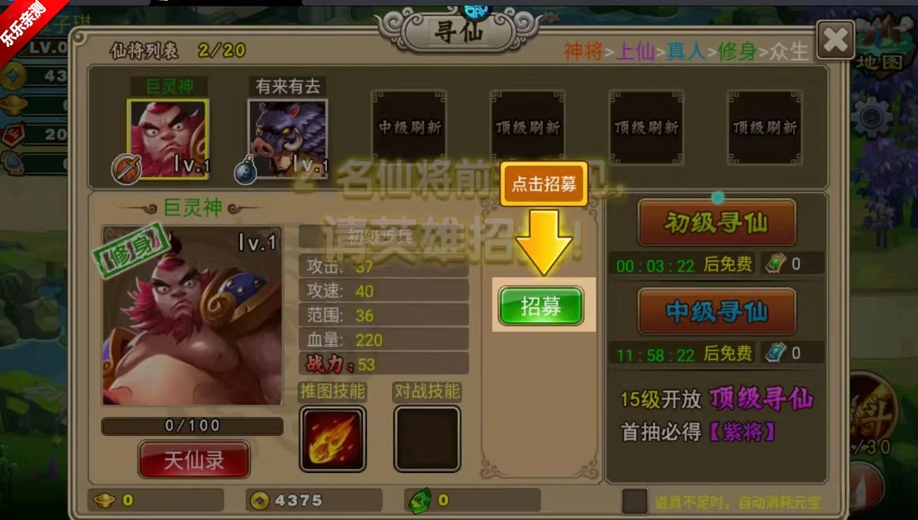 进入游戏后,主界面右下方设有寻仙入口,玩家可在此抽取心仪仙将,不同颜色的寻仙令牌对应不同抽取方式。寻仙令牌共分三类:绿色令牌对应初级寻仙,单次使用可获得两名仙将,有低概率产出真人、上仙;蓝色令牌对应中级寻仙,单次使用可获得三名仙将,有概率产出上仙,且低概率掉落神将(划重点!中级寻仙就有机会抽到神将哦~);紫色令牌则对应顶级寻仙,单次使用可获得六名仙将,产出上仙的概率较大,也有低概率抽到神将,不过顶级寻仙需玩家角色等级达到15级(或VIP等级升至3级)后才会解锁。