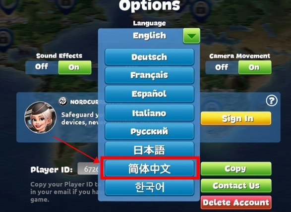 进入设置界面后,能看到“language”选项当前显示的是“English”。