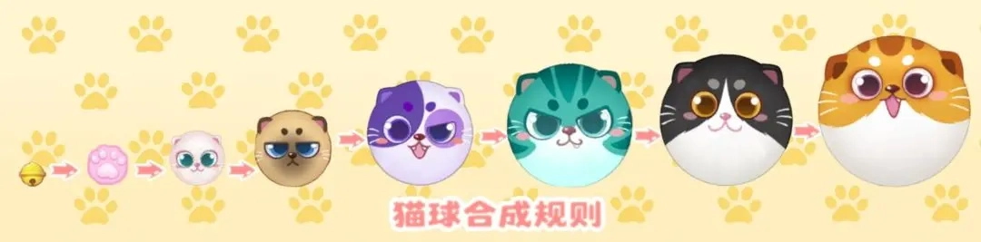 可以通过合并两个一模一样的猫球,来得到尺寸更大的猫球,关于猫球合成的详细规则,大家可以参照下面的图示: