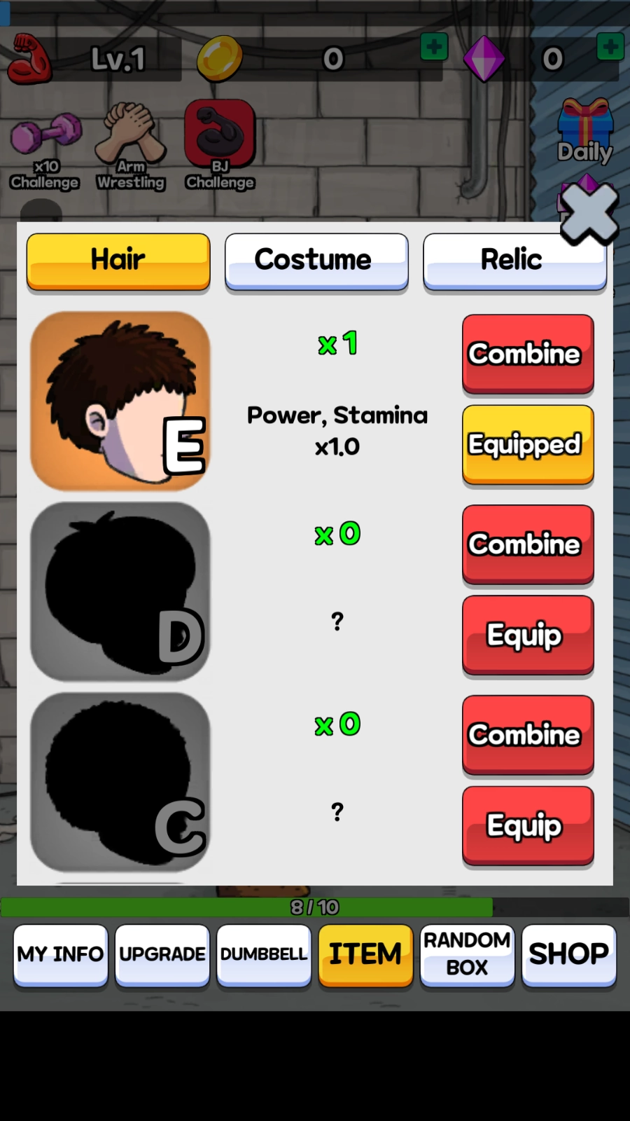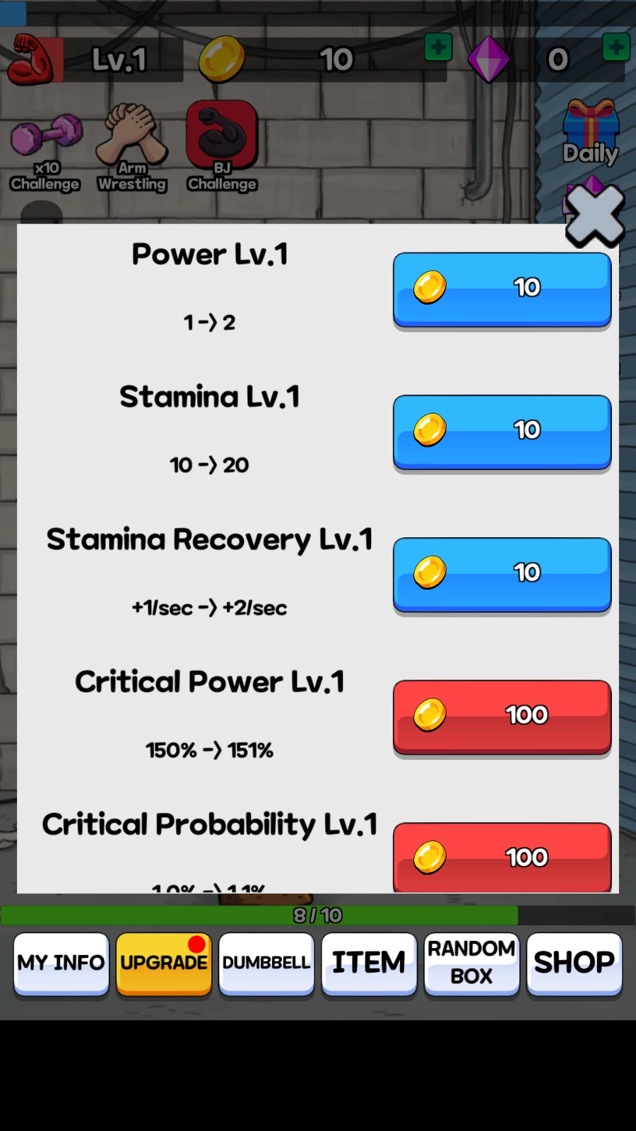 3、要是比赛输了,可以点击UPGRADE来提升自身属性,或者点击SHOP购买道具,等实力变强后再去挑战,努力赢下掰手腕比赛。