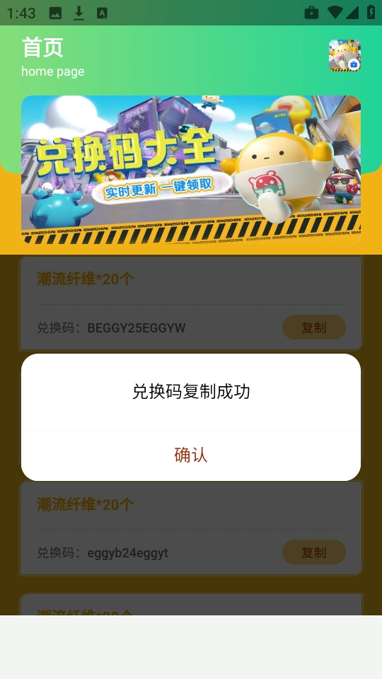 3、挑选任意一个兑换码,点击就能完成复制,同时确认该操作。