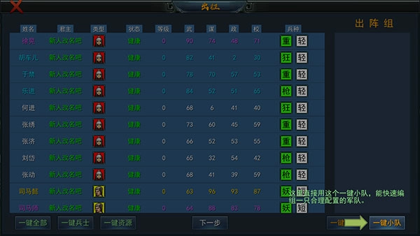 6、点击出征按钮后,会进入编组界面,此时点击右下角的“一键小队”功能,就能快速完成队伍编组。