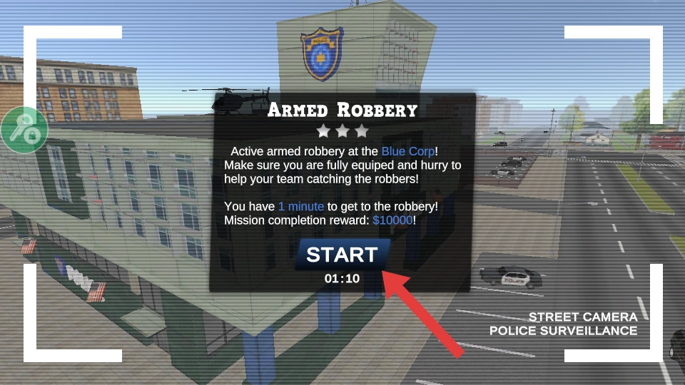 2、领取【Armed-Robbery】任务,需在1分钟内前往Blue-Corp制止抢劫行为,请点击【START】启动任务。