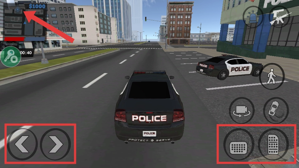 3、驾驶警车时,通过左侧的【方向键】来操控转向,右侧的【油门】与【刹车】用于控制车速,按照小地图的指引前往任务地点。