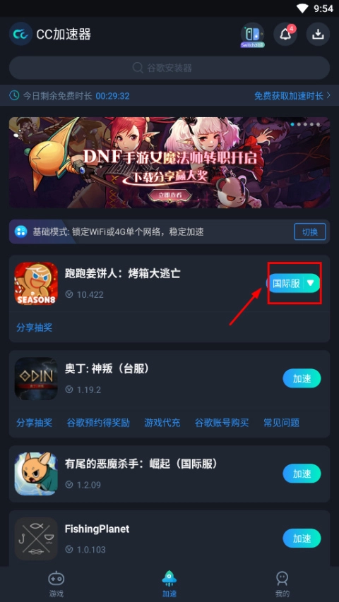 1、启动CC加速器,在应用列表里找到跑跑姜饼人这款游戏,接着选择想要连接的目标服务器,比如国际服或者港服;