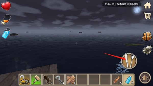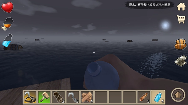 1、游戏开局先用钩子收集资源,记得别漏掉木桶,要是钩子勾不到就下水去捞;优先制作杯子和煮水器,之后再打造炉子和鱼竿。