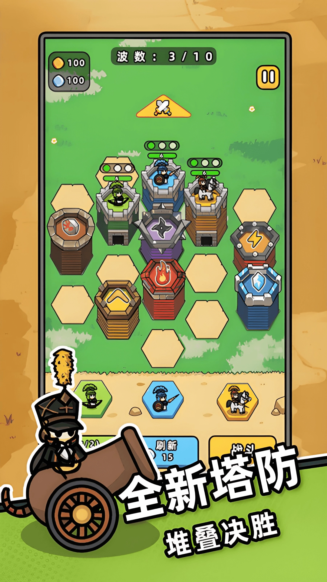 1、借助卡牌召唤士兵并布置防御塔来搭建防御体系,抵挡敌人一轮轮的进攻,在战斗过程中收集新卡牌以增强队伍的战斗力。