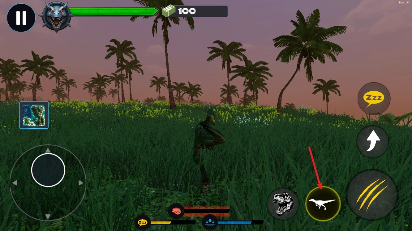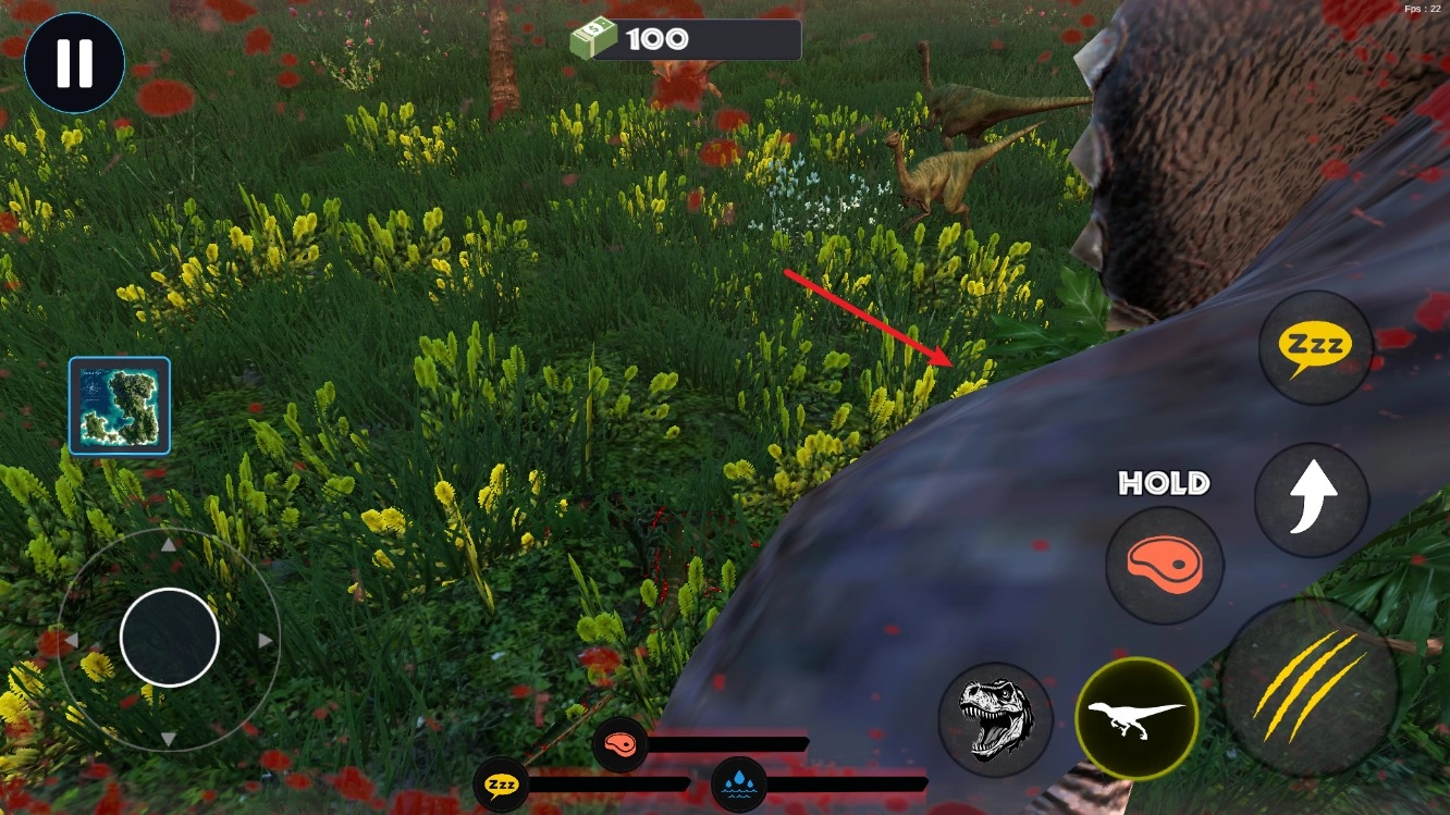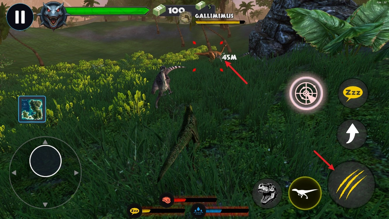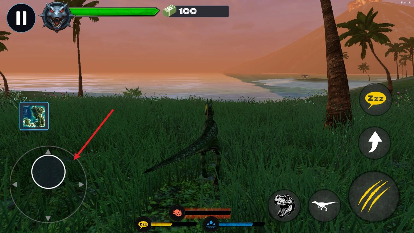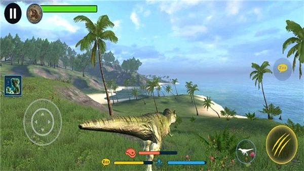 2、屏幕左侧的虚拟摇杆用于操控恐龙的移动方向,长按该摇杆能够让恐龙持续移动,便于玩家追击敌人或躲避攻击。