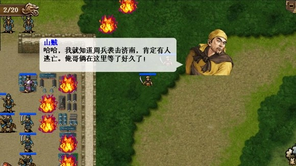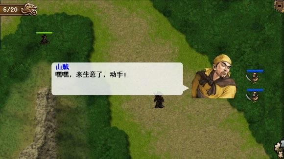 宁氏和秦安沿着下方的路径前进即可,行进至第二个回合结束时,会遭遇第一批埋伏的敌人;继续走到右上方的转弯位置,还会遇到第二批伏兵,这两批敌人各有两名山贼,秦安的攻击和防御能力在此过程中都会得到提升。