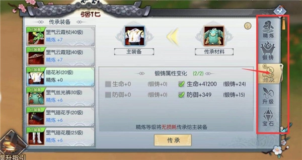 装备系统中的传承功能,能把作为材料的装备所具备的精炼和锻铸属性转移到主装备上。当品质较高的装备作为材料进行传承时,即便主装备品质更低,其精炼等级也会被完整保留下来。