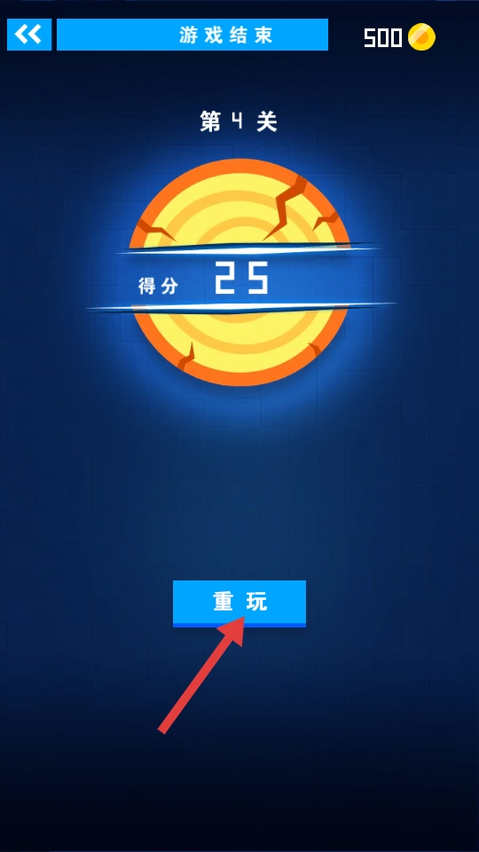 游戏结束后点击【重玩】按钮,就能继续挑战关卡、积累分数,进而提升游戏技巧。