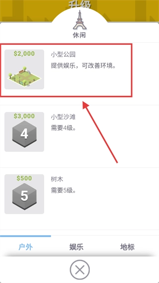 升级界面可建造【小型公园】,需投入【2000】元,该设施能提供娱乐功能、改善周边环境,吸引市民前来,同时优化城市生态系统与居民居住体验。