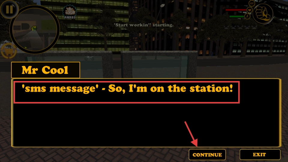 在剧情对话环节,点击【CONTINUE】按钮可推进剧情发展;当获取到任务相关信息后,需前往指定的目标地点。