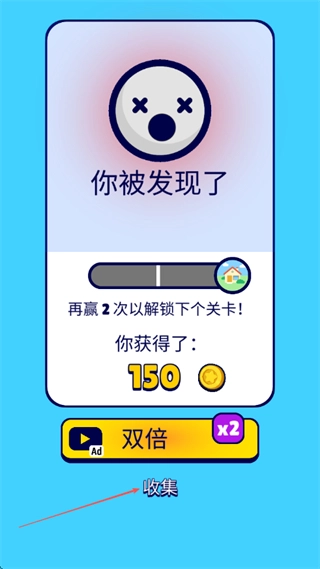 要是被发现了,屏幕上会提示你已被发现,这时能领取金币奖励,点击收集后就能继续游戏,再获胜两次就可以解锁下一关了。