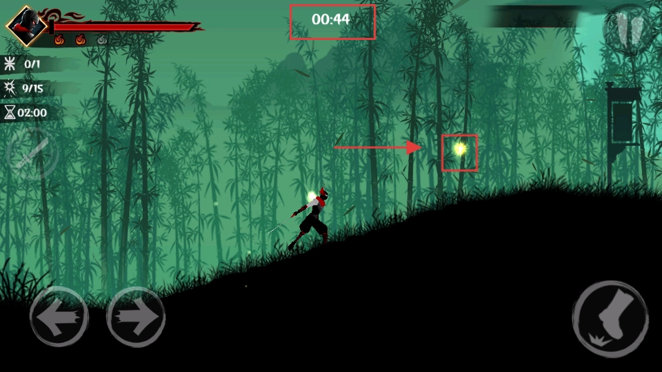 在【00:44】这类限时条件下,控制忍者移动以收集发光的道具,从而提高任务完成度,要留意剩余时间。