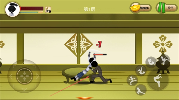 操控游戏角色对敌人发起攻击,造成的伤害会以类似-7这样的数值呈现,同时借助左侧的摇杆来控制角色的移动和走位。