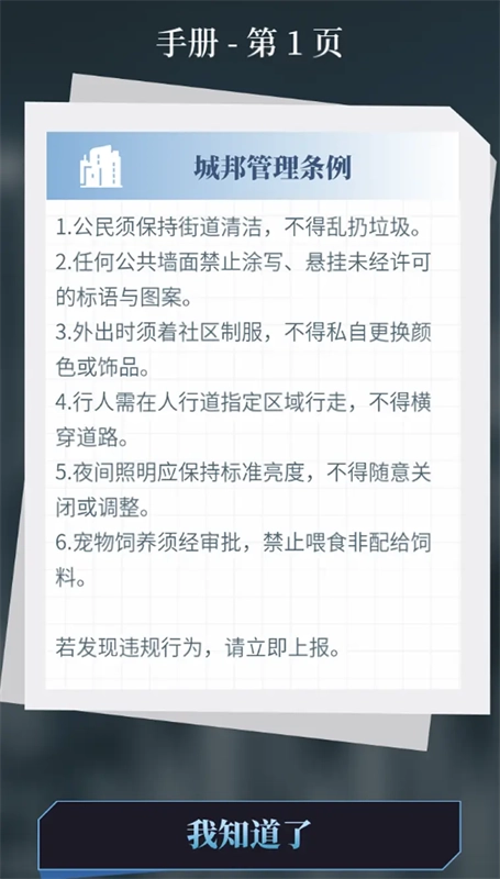 玩家化身为“审查员”,在一个名为“城邦”的理性社会里履职,其工作内容是严格遵循既定规则,去找出并消除人类行为里存在的“Bug”。