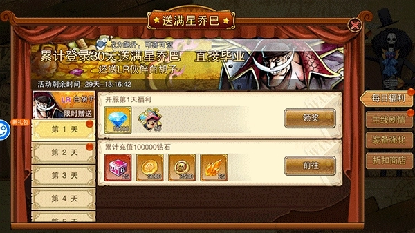 7、如果条件允许,购买月卡或永久卡可使游戏体验更加愉快。使用赠送的乔巴作为治疗者,通过PvE玩法提升。连续登录30天,可获得白胡子LR卡,有助于后期游戏的发展。