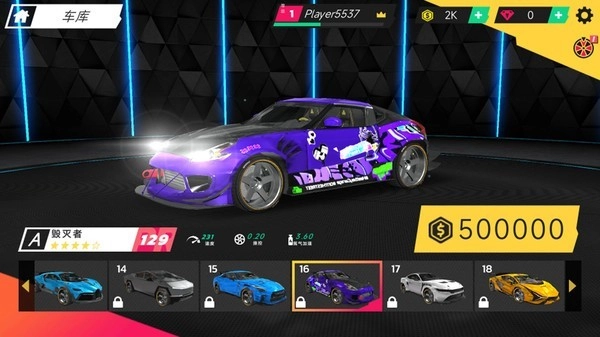 首先到车库挑选车辆,这里有各式各样的赛车,它们不仅外观酷炫,性能也十分强劲。