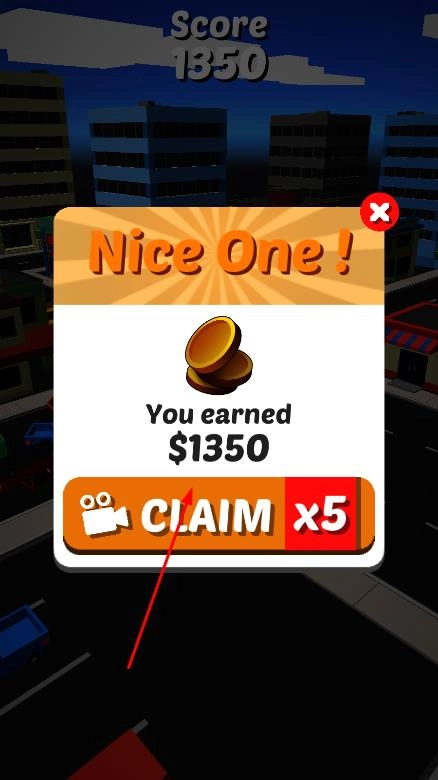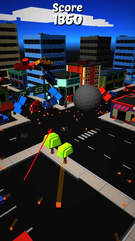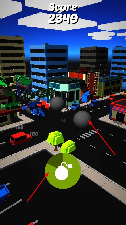 通过屏幕左下角和右下角的左右方向按钮控制球体移动方向,球体撞击道路上的车辆,每撞击一辆车,会获得相应的分数。