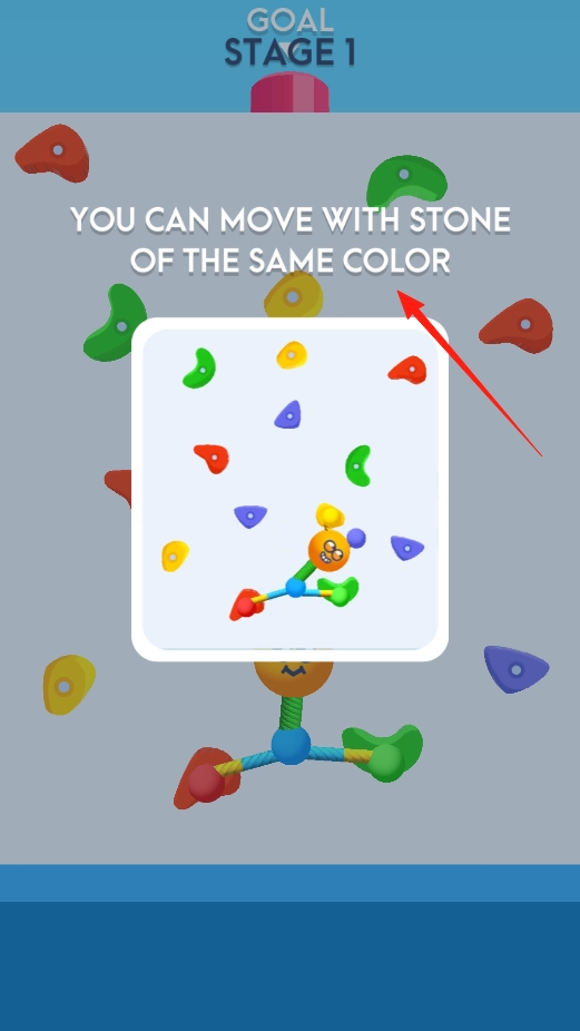 2、按照提示移动相同颜色的岩点,角色借助绳索在对应颜色的岩点之间进行切换,规划好攀爬的路径,掌握规则玩法,感受颜色匹配的机制。