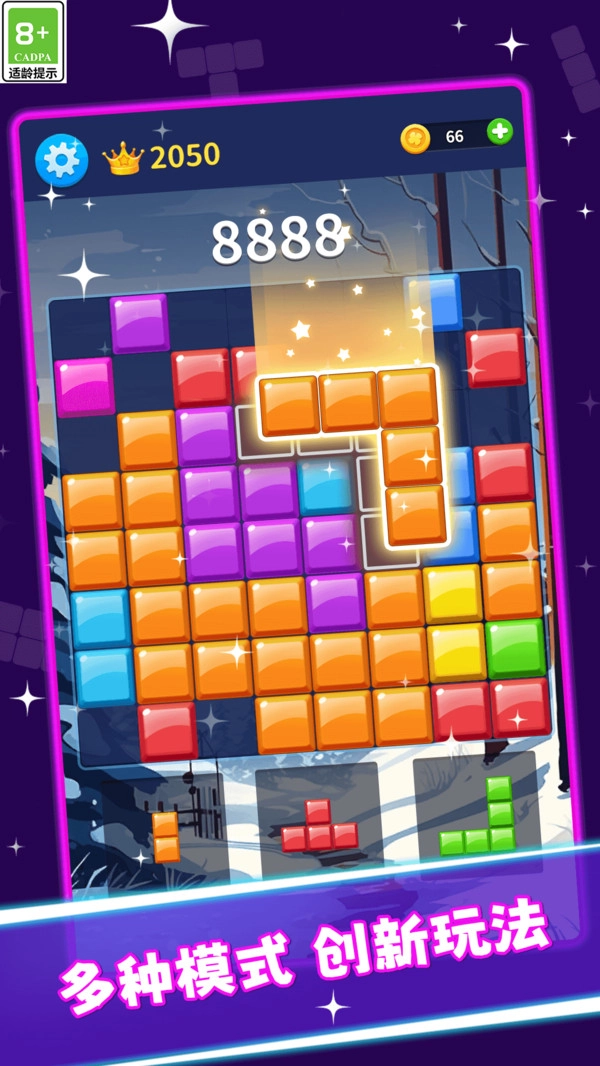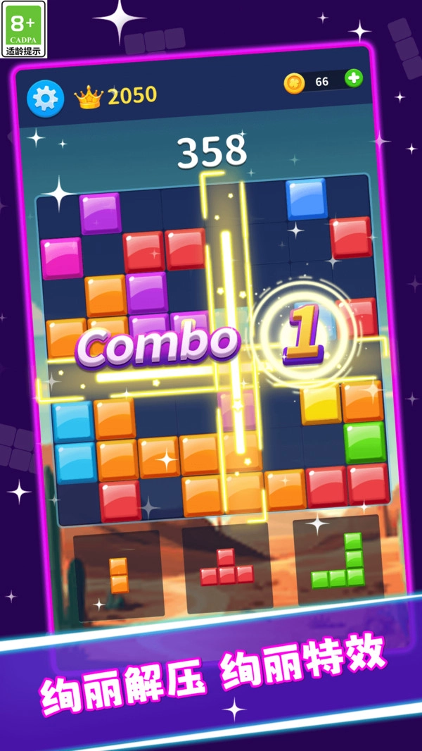 全新方块消除游戏来袭,适合全年龄段的新老玩家,相较于怀旧制作"俄罗斯方块",新版游戏全面升级,玩法多样,全新的消除动画,给你带来意想不到的视觉盛宴,快分享给你的小伙伴一起来玩吧!玩法:玩家可以将屏幕下方的三个备选方块拖入上方的格子中,让一行或一列铺满即可消除。玩家需要在保证后续方块可放置的情况下,安排好每个方块的位置,实现消除,连续的消除方块会获得额外的加分。当备选方块无法放置,则游戏结束。