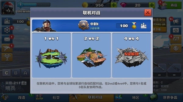 3、在联机对战模式下,您会与来自全球的玩家进行自动匹配对战。当参与2vs2或4vs4的对战时,您将分别与1名或3名队友配合,共同协作完成战斗任务。