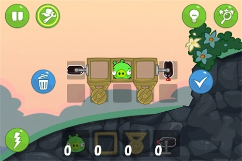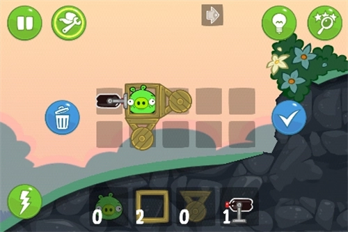 2、还有一种方法是借助火箭飞行来通关,无需使用木轮。具体操作步骤为:启动火箭,升空后碰到右侧的石壁,随即调整飞行方向就能过关。在设置组合时,只要是高度满足要求的组合就可以了。