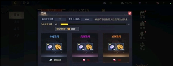 1、公会签到功能每日可参与一次,完成后能获取贡献币与公会资金。对于普通玩家而言,每日使用银币签到即可;而对于游戏大佬或有冲击排行榜计划的玩家,则可以选择用粉钻将签到奖励拉满。