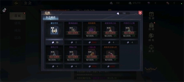 5、公会商店:由公会会长负责升级,商店等级越高,可兑换的道具珍稀度就越高。每日可免费领取1个体力药水;当商店等级达到3级时,每月还能免费领取1个橙色使魔。此外,强化药水无购买次数与数量限制,可根据自身需求随时兑换,且该道具仅在公会商店产出。