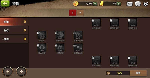 特性分为三大类:射击,生存,技术;