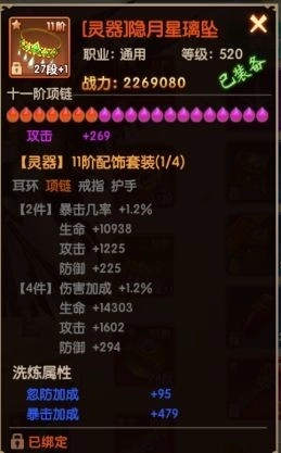 当穿戴一定属性同炼器等级、同品阶、同套装类型的装备时会激活套装属性;