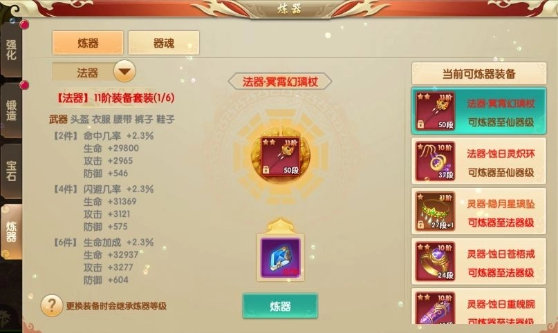 可通过炼器为装备加上前缀属性,一共有6个炼器等级(从低到高:灵、法、仙、神、圣、荒器);