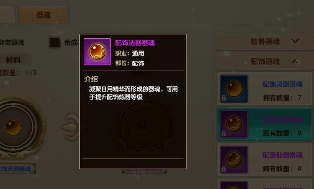 器魂凝聚日月精华而成的器魂,用于提升装备炼器等级,可分成装备器魂和配饰器魂,合成时可选择是否合成绑定器魂,合成的器魂等级同样从低到高分为:灵、法、仙、神、圣、荒器;