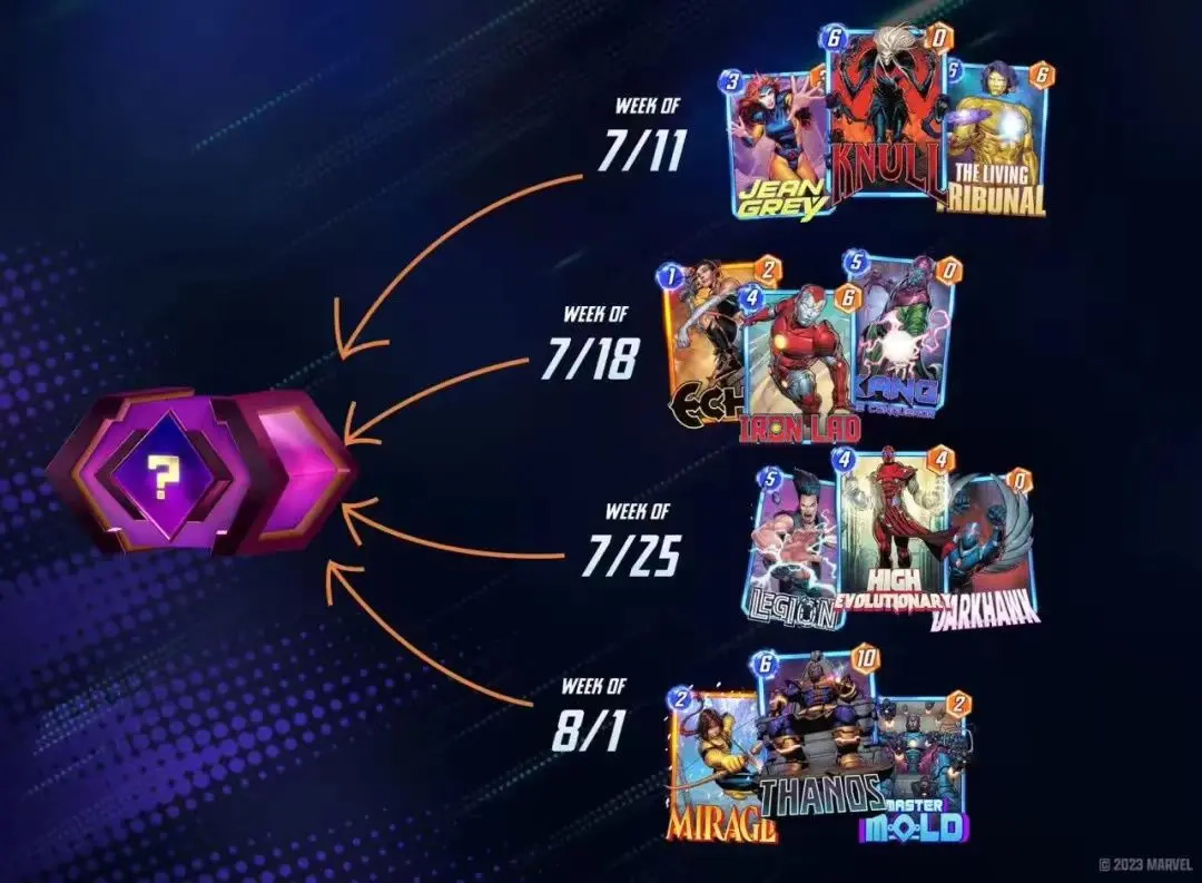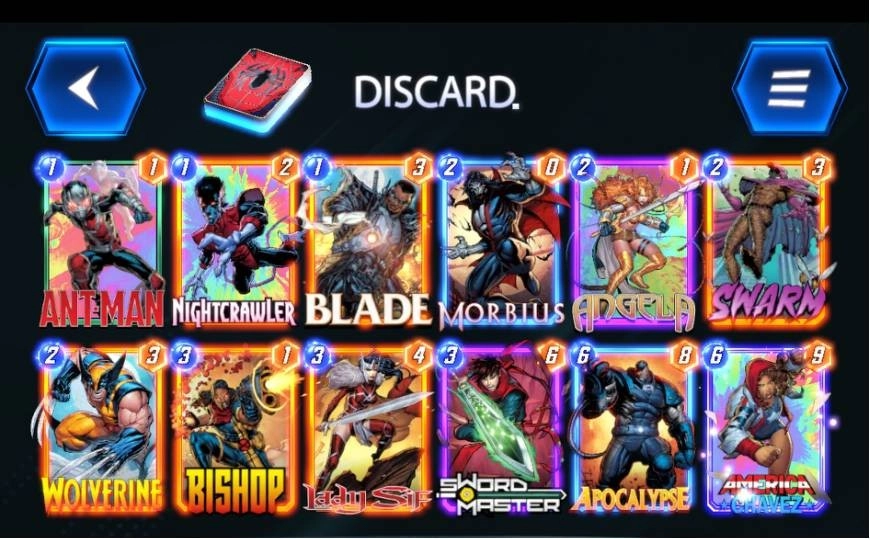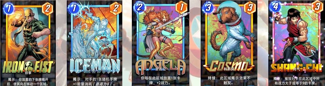 中文卡牌列表:蚁人、夜行者、刀锋战士、莫比亚斯、安吉拉、蜂群、金刚狼、毕肖普、西芙女士、剑仙、天启、阿美莉卡