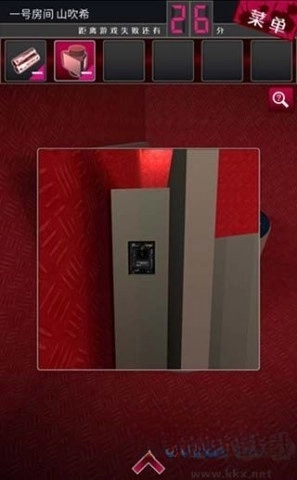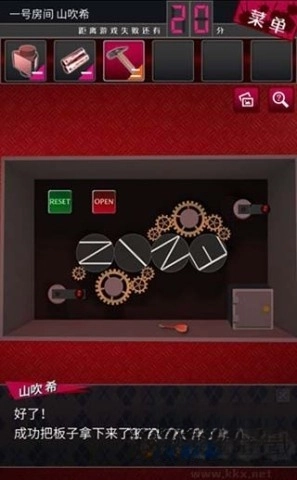 准备与三号房间交换道具,获得球杆。利用球杆拉动小箱子,得到齿轮。随后与四号房间交换道具,获得纱布。前往板前,装上齿轮和纱布,调整字母得到“NINE”,再点击“OPEN”,成功获取钥匙。