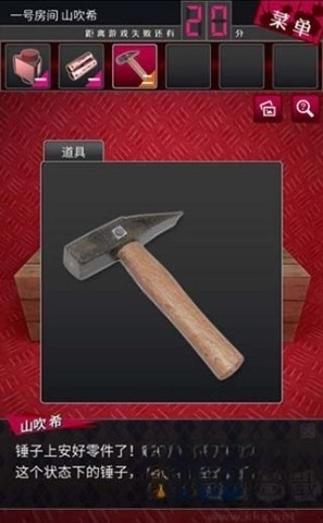 点击下方的彩色盘,输入密码4827,获取磁带。准备与二号房间交换道具,得到锤子。使用锤子砸开木箱,收获尖块,并与锤子组合。