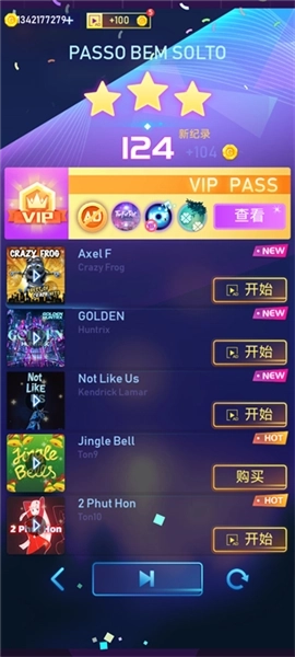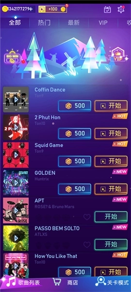 打开游戏后,在歌曲列表界面能自主挑选各类热门或最新的曲目,点击开始按钮就能开启节奏挑战。