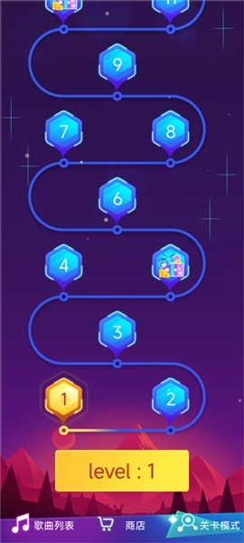 除了歌曲挑战外,游戏还设有关卡闯关模式,玩家可以在不同场景里感受更丰富的节奏挑战,收获满满的成就感。